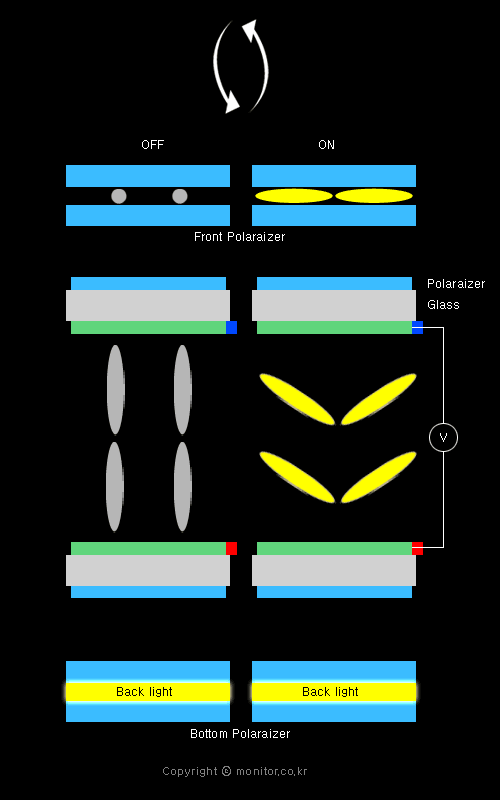 전력 OFF시 수직 상태에 있는 액정 크리스탈이 빛을 잘 감쇠시켜